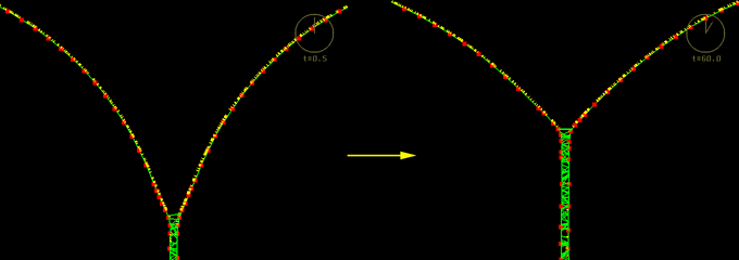 Two model cells zipping together and causing a cortical flow (courtesy of Ed Munro). This image is associated with a low resolution movie [new window, 680x710 pixels, 444 KB]. and a high resolution movie [new window, 680x710 pixels, 1.3 MB]. Click the image to see the low resolution movie.