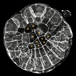 This is a projection of a 110-cell embryo in the midst of invagination. In this embryo the vegetal plate has flattened but the endoderm cells still have a ways to go. This 3-D reconstruction is available in three sizes. The movies will open in a new window sized as indicated. View the small version of the movie [500x500 pixels, 470 KB], or a larger version [600x600 pixels, 1 MB], or the full-frame version [760x760 pixels, 4.2 MB]. Posterior is to the upper left, endoderm cells are marked with asterisks.