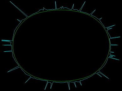 In the simulations, we use a radial plot to indicate the concentration of actomyosin in a given cortical segment. Thus, each peak corresponds to one focus, with tall peaks representing big bright foci in the live GFP myosin embryo movies. The ring of peaks is representative of a typical great circle (or great ellipse) of the three-dimensional embryo, as shown below: