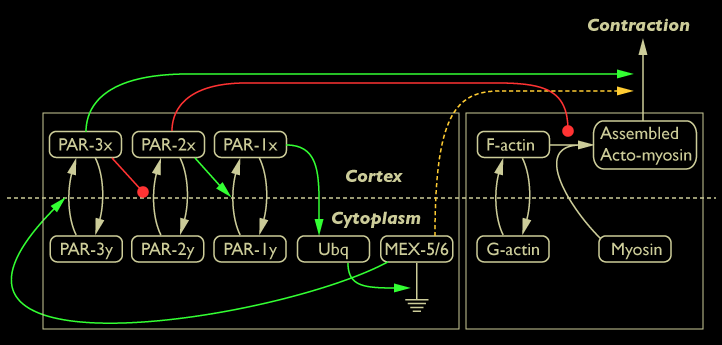 Diagram of interaction between Par/Mex network and cortical actomyosin dynamics (possible link between MEX-5/6 and actomyosin contractility shown in yellow). In addition, although it is not convenient to include it in this diagram, actomyosin contractility leads to asymmetric distribution of Par proteins on the cortex.