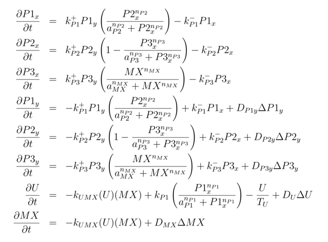 In this section, we will focus on the Par/Mex component of the network model. These interactions were synthesized from the current literature. This does not, however, ensure that these interactions are reasonable or representative of the dynamics that are present in the embryo. For the purposes of modelling, we consider the cell to be divided into two compartments, the cortex and the cytoplasm. Proteins can freely diffuse in the cytoplasm but can only redistribute in the cortex by dissociating, diffusing in the cytoplasm, and reattaching to the cortex at another position. To investigate if this network diagram is reasonable, we developed a mathematical model of these interactions and then simulated these numerically.