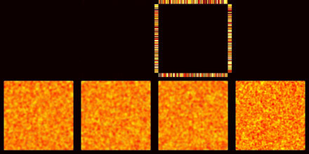 Layout of proteins in numerical simulation, and colour map for protein concentrations; low=black, high=white