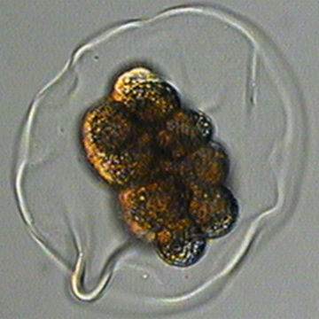 The bryozoan Membranipora spawns teeny pinkish eggs that come out as little skirt-wearing doughnuts, but they slowly round up before they cleave. The first two cleavages are equal, but then the embryo commences to cleave unequally, producing tiers of different-sized blastomeres.